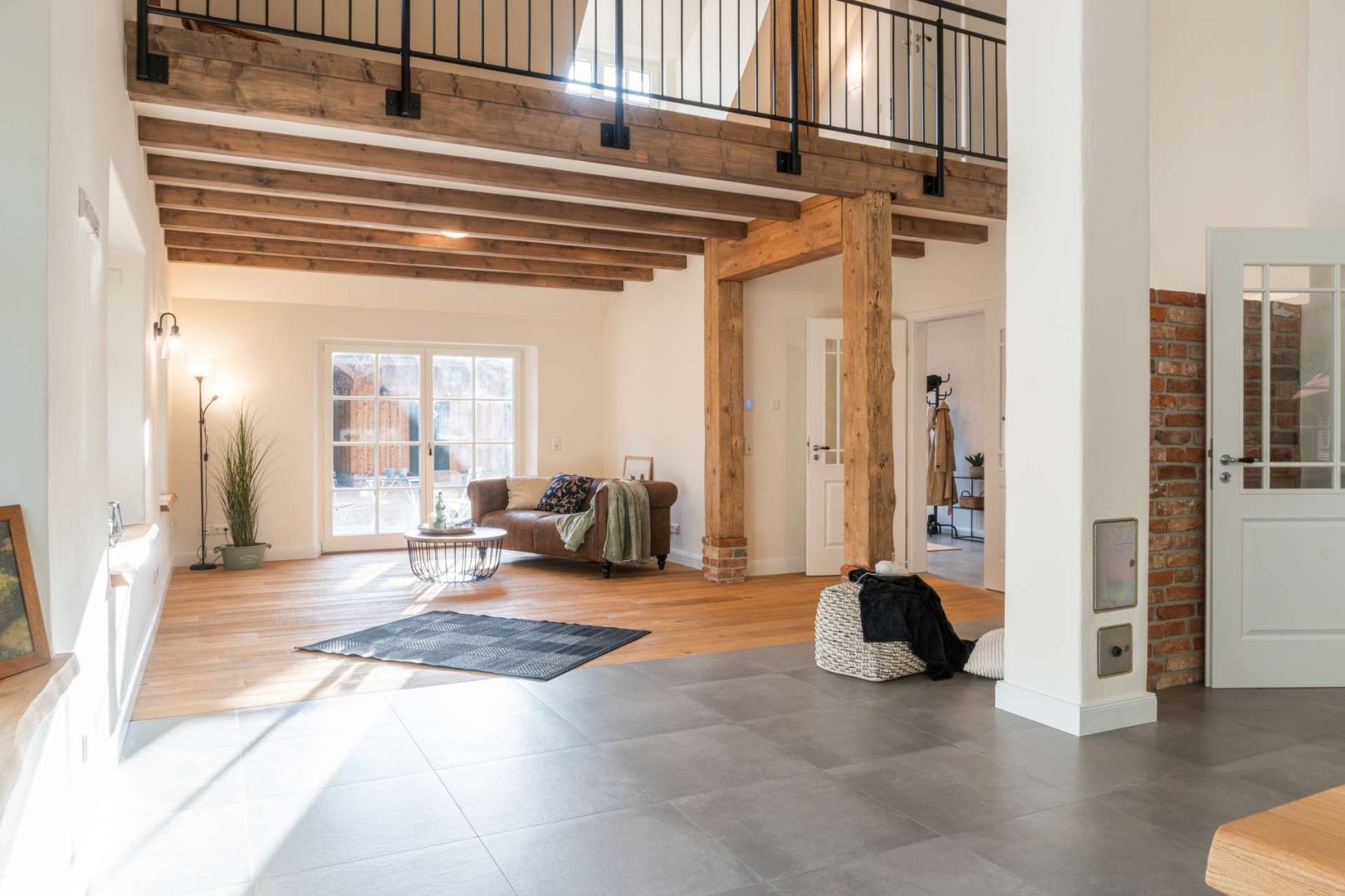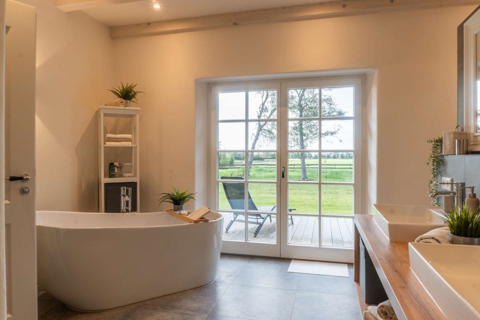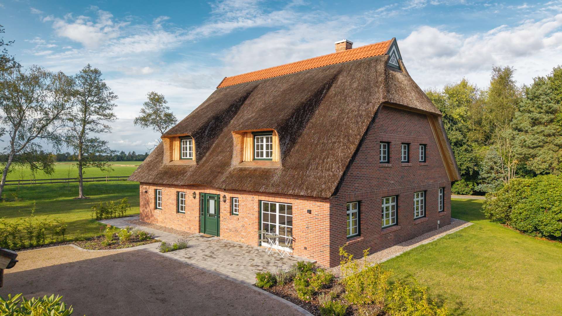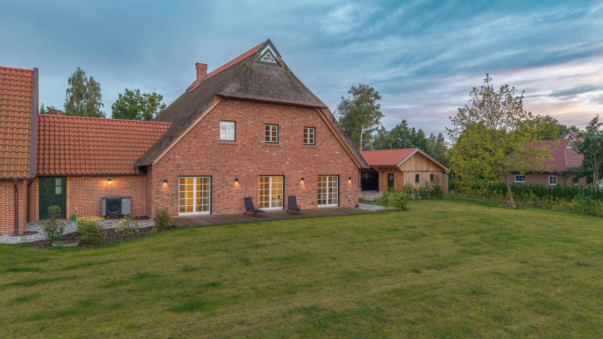 Auf rund 257 m² Wohnfläche bietet das Haus einen großzügigen Wohn-, Ess- und Kochbereich mit Galerie, drei Schlafzimmer, zwei stilvolle Bäder, ein Gäste-WC sowie Büro- und Nebenräume. Hochwertige Materialien wie Eichendielen, geölte Fichtendielen, Lehmputz und sichtbares Holzständerwerk sorgen für ein unvergleichlich natürliches Wohnklima. Die maßgefertigte Landhausküche sowie die luxuriösen Bäder mit Regendusche und freistehender Wanne setzen elegante Akzente.