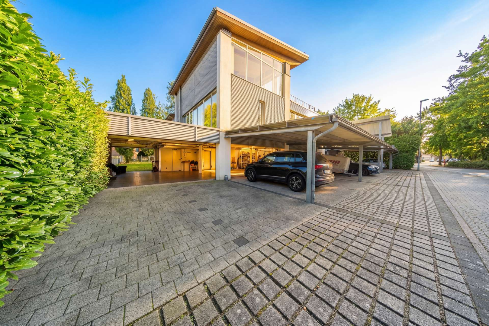 Die im Haus integrierte, beheizbare Garage (ca. 137 m²) bietet Platz für bis zu 6 Fahrzeuge und ist zudem ausgestattet mit zwei Hebebühnen, sodass Pflege, Wartung oder Präsentation der Automobilen-Schätze direkt vor Ort erfolgen können. Ergänzt wird das Konzept durch sechs zusätzliche Carport-Stellplätze sowie zwei Stellplätze direkt vorm Haus.