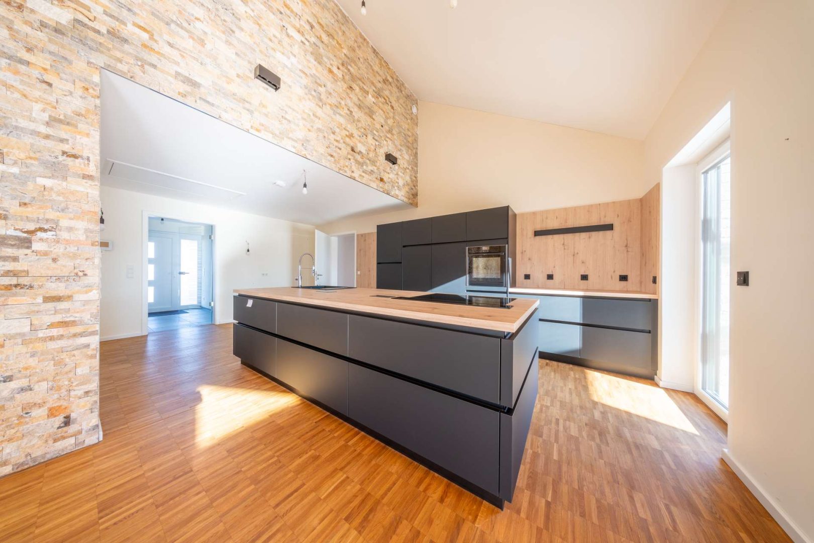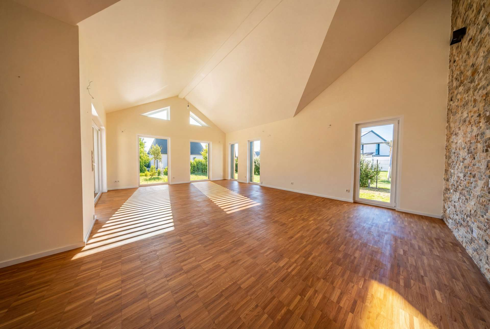 Die ebenerdige Bauweise ermöglicht ein besonders komfortables und zukunftssicheres Wohnen auf einer Ebene. Auf ca. 154 m² Wohnfläche entfaltet sich ein großzügiges Raumkonzept mit klaren Linien, viel Tageslicht und einer harmonischen Verbindung zwischen Innen- und Außenbereichen. Herzstück des Hauses ist der weitläufige Wohn- und Essbereich mit beeindruckenden Raumhöhen und großen Fensterflächen, die eine helle und offene Wohnatmosphäre schaffen.