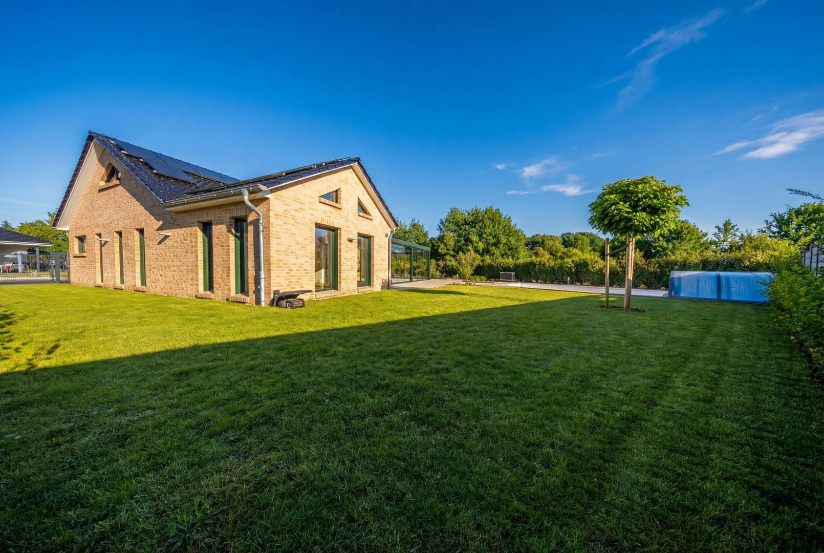 Besonders hervorzuheben ist der großzügige Terrassen- und Wintergartenbereich mit großflächigen Verglasungen, der eine geschützte Nutzung im Außenbereich ermöglicht, über das Smarthome System voll verschattet werden kann und das Wohnen harmonisch in den Garten erweitert.