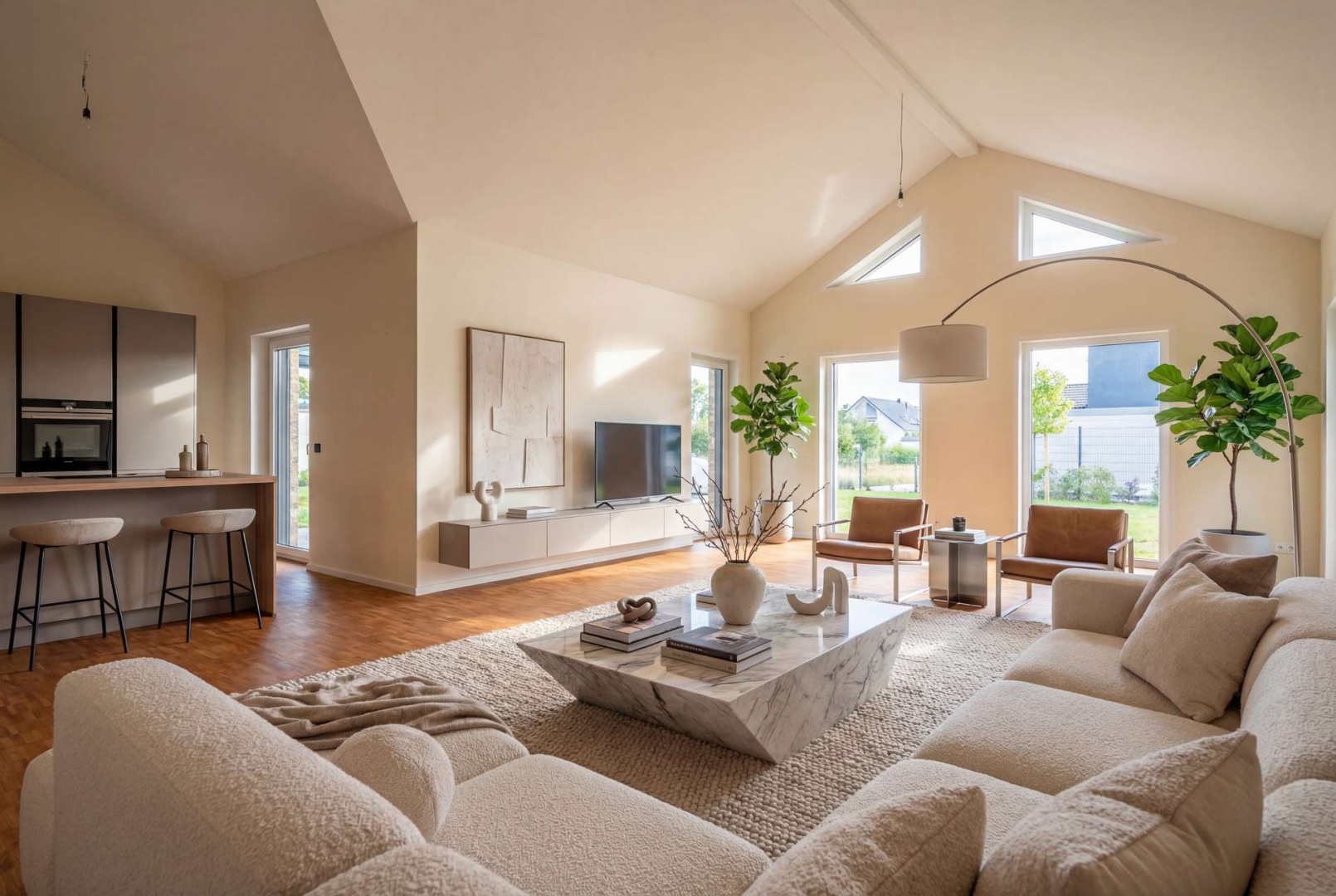 Die hochwertig ausgestattete Küche fügt sich elegant in das Wohnkonzept ein und bildet gemeinsam mit dem Wohnbereich den zentralen Treffpunkt des Hauses. Ein komfortabler Schlafbereich mit Bad en suite, ein Gäste-WC sowie weitere funktionale Räume sorgen für eine durchdachte Raumstruktur und hohe Alltagstauglichkeit.